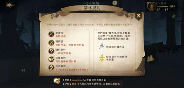 禁林是哈利波特魔法觉醒的PVE副本,可最多两人组队进行通关,记得叫上自己的小伙伴哦。当然如果一个人进入禁林系统会自动匹配一个玩家与你组队,可以选择“太棒了!我也有点害怕呢”跟随队友(队友控制选择每一关的探索方式)、“那你就跟在我身后吧”带领队友(自己选择每一关的探索方式)、“我有其他事情,下次一起吧”(可单独探索,系统还是会匹配新队友继续让你选择)