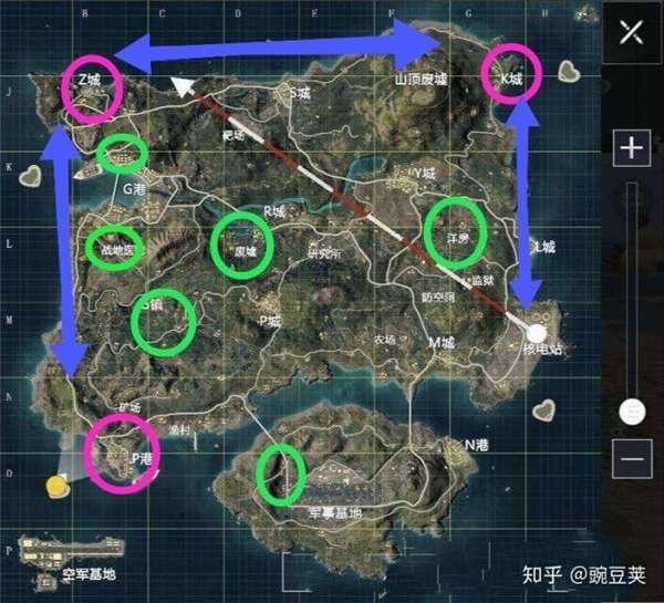 第一点就是不跳资源丰富的地方,不跳人多的地方。我刚才说过,任何可能导致你死亡的行为都要禁止。有人问,那我不搜装备的嘛?答案是,搜。请看上图,粉色圈标注的地方可以视情况去搜搜看。那么,哪些情况下可以去呢?比如说航线的起点和终点不是这些地方,安全区不在这些地方,就可以去。如果你确定了要去这些地方,请落地之后迅速搞到车,因为这些地方很偏,又不在安全区,如果没有车的话很难跑出来,就算出来也很浪费饮料止痛药。
