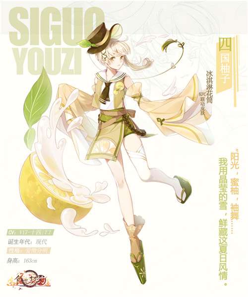 绘制联动皮肤“四国柚子”时,《食之契约》以还原四国柚子冰淇淋花筒产品特点为基础,加入了许多富有想象力的元素,打破次元壁,让一个形象鲜明饱满的四国柚子冰淇淋花筒跃然纸上。足下的高木屐彰显了“四国柚子”的异国风情,礼帽上一大一小的嫩绿叶片还原了四国柚子的萌态,周身围绕的金黄的柚子、随意洒落的柚子汁,让她看起来更加清甜可口。玩家可通过连续5日登陆游戏免费领取此款联动皮肤,这也是《食之契约》为玩家送上的夏日福利!快来《食之契约》遇见清新吧!