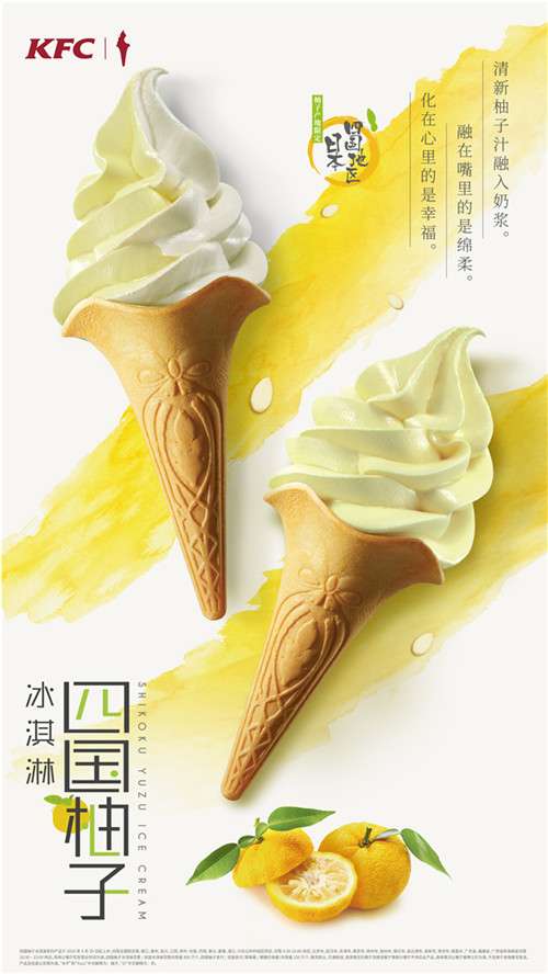 四国柚子源于日本四国岛,它的样子非比寻常。四国柚子的叶片由一大一小组合而成,甚是可爱。肯德基将漂洋过海的四国柚子整颗榨汁,将酸甜可口的柚子汁融入浓醇奶浆。香浓丝滑的经典冰淇淋带来甜蜜,清新微酸的柚子汁带来清新,让夏天的微风中也夹杂着一丝清香。