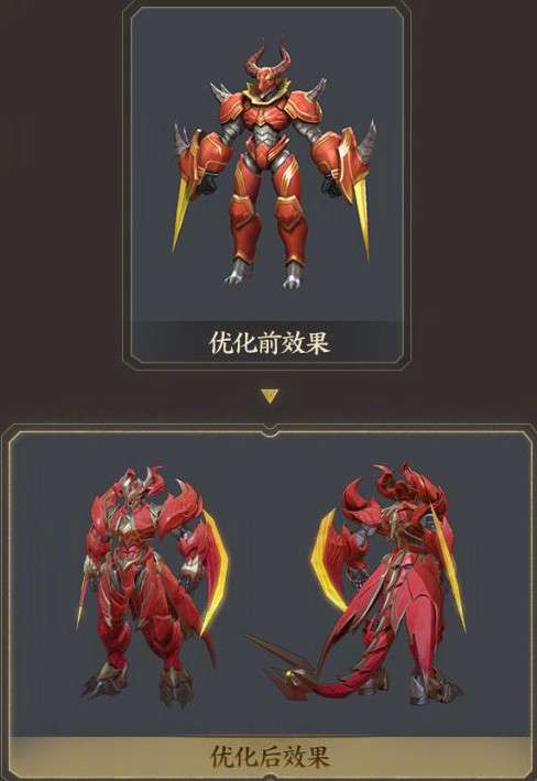 然后是龙骑士,可以看到,官方优化后的龙骑士还会保持原有的配色,但是整体看上去更像一只龙了,特别是背部的设计,感觉真的比较兽化了,现在就是期待特效还有动画等方面的优化,相信2888点券才能入手的皮肤应该不会太差。