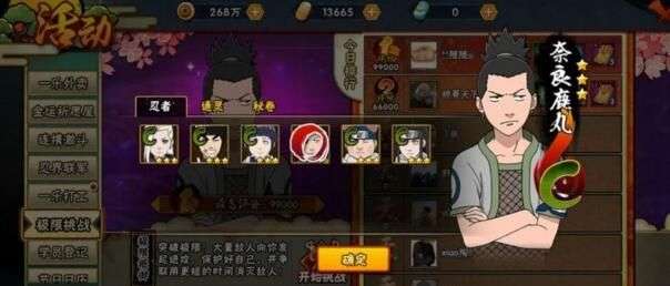 这个活动只能选系统规定的忍者密卷和通灵,玩法也就是过关速度快分越高,第一名可以拿更好的奖励,你们今天来讲讲怎么样过关速度最快吧!首先我们要选鹿丸,通灵搭配鲨鱼或者貘,密卷选风杀。