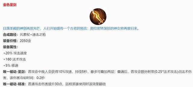 金色圣剑严格意义上来说并不是一件新装备,而是老版本中针对法师的一件装备。在当年金色圣剑还没有被移除的时候,高端局露娜玩家是必出金色圣剑的。