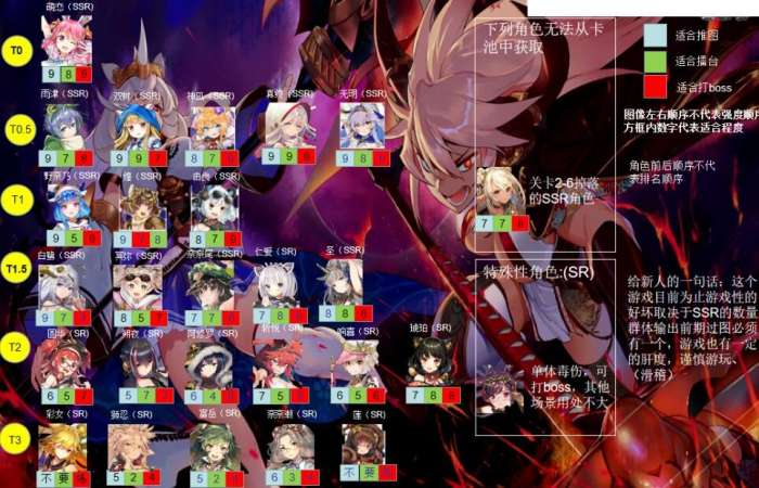 总而言之,前期就按照图中所示培养角色即可,T1以上的角色抽到就编入队伍无脑养,因为后期这几个角色也是队伍的主力。SSR全体群伤前期必须有一个,能极大改善推图的效率。