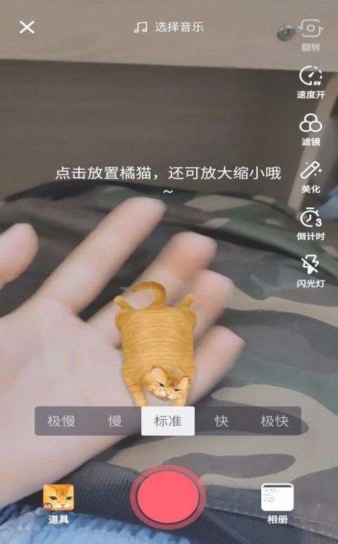 首先打开抖音软件,在搜索框中输入AR橘猫特效,在道具中点击使用,点击拍同款,拍摄视频时就可以看到橘猫了。点击一下就可以放置橘猫,还可以进行放大和缩小的操作。刚拍摄时,如果在一个固定的位置,你还可以用手将它托起,非常可爱。