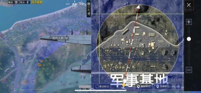 由于航线长度较短,我们尽量在离开飞机的按钮刚出现的时候便点击按钮,并利用“斜飞速降”的跳伞方式,抢占房屋作为开局落脚点。