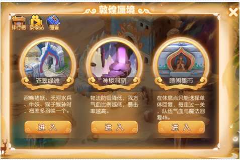 敦煌蜃境开局会让玩家选择三个道具:苍翠绿洲、神秘洞窟和喧闹集市。
