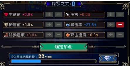 总而言之,修罗之力加点属性上限是100%,除非你砸个几百万的灵魂结晶,不然是看不到头的。前期的话建议留着买其他东西,后期灵魂结晶多得用不出去之后,再点比较好。