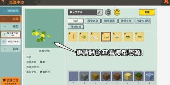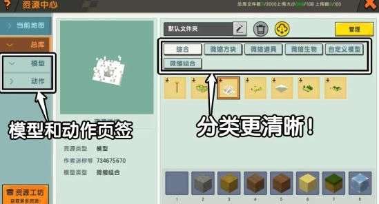 新版本将资源进行分类(微缩方块、生物、道具、组合等等),帮助你更快的找到需要的模型。