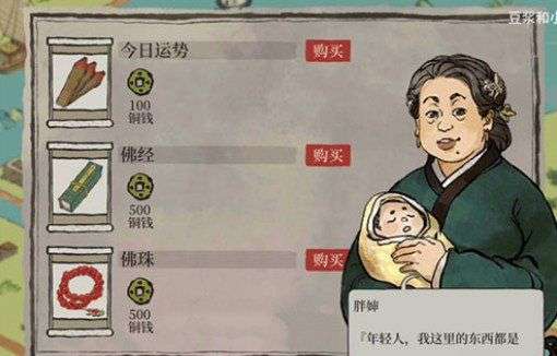 这个佛堂里面出售佛经(500铜币)、佛珠(500铜币)、今日运势(100铜币)。