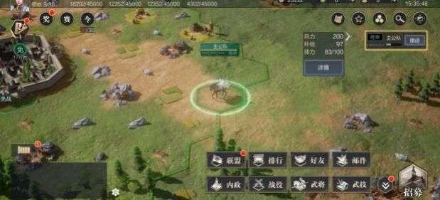 此时该军团在休整结束前不可攻占其它资源地块,但可以返回大营。军团位于大营中时,可以在配置界面快速分配兵力和调整阵容等,而预备兵源需要在城建中的征兵中花费资源获取,在征召期间会源源不断地获取兵源。