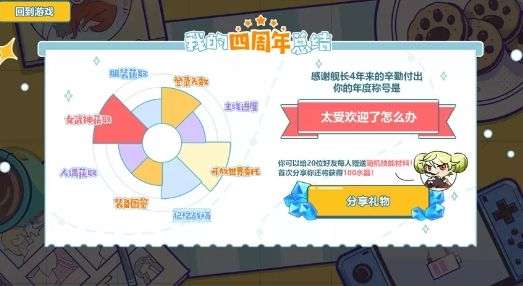 每位舰长会送出不同的礼物,礼物内容由舰长获得的“四周年年度称号”决定!每份礼物最多可以被20位舰长打开哦~荣获「这是....强者的味道」称号的舰长,将会送出包含200水晶的礼物!如果看到身边有哪位小伙伴获得了这个年度称号,记得一定要让他分享礼物哦!