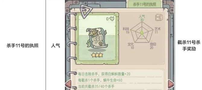 杀手11号的执照:人气:每日击败杀手白蝌蚪+20,每截杀1个杀手,蜗牛生命+60,上限40个杀手:截杀11号杀手奖励