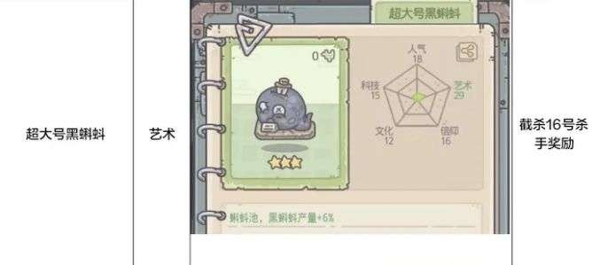 超大号黑蝌蚪:艺术:蝌蚪池,黑蝌蚪产量+6%:截杀16号杀手奖励