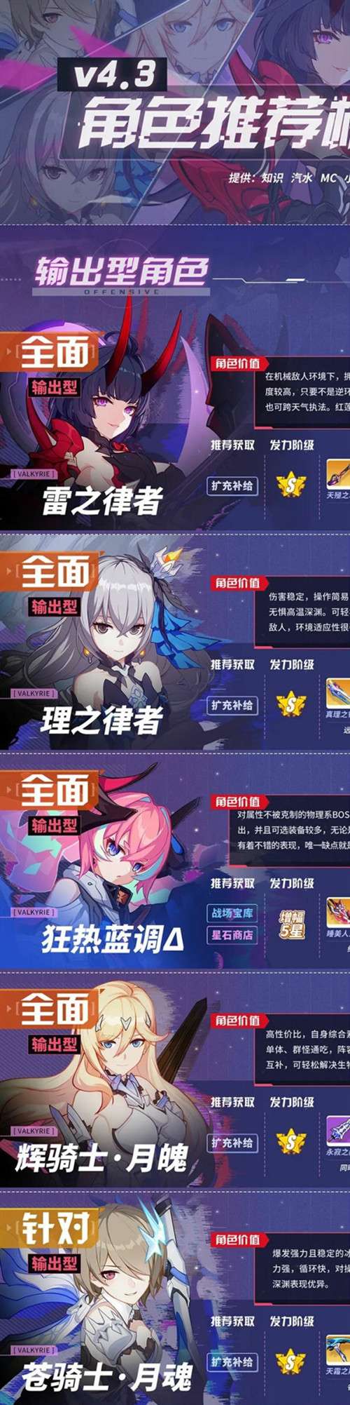崩坏3最新4.3版本推荐角色有谁?在崩坏3的游戏中,4.3版本的最新角色强度排行榜已经新鲜出炉了,大家知道谁才是最强的角色呢,这次浏览器小编将所有角色的排名进行了统计,并将输出与辅助型角色区分开来,希望能帮大家推荐出最适合玩家们选择的角色。