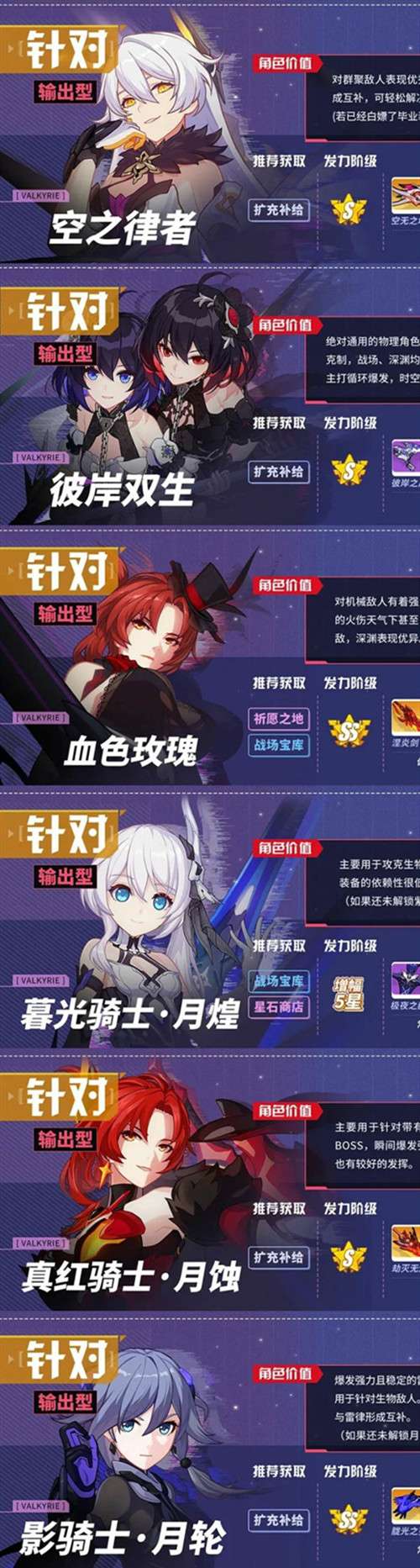 由于近期版本的角色表现更加依赖环境,并且过去的推荐度等级高低容易模糊推荐表本身的意义,能进表内的角色均为有一定培养价值的角色,只是类型不同,故本次推荐表将原本的推荐度等级修改为「全面」、「针对」、「过渡」。