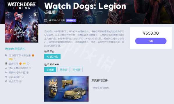 育碧(中国)官方网站也已经开启了预购,标准版358元,黄金版598元,终极版718元。