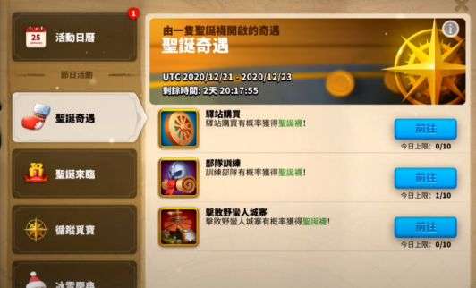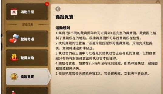 “寻踪觅宝”和王国宝箱一样的兑换方法。需用过商店购买、部队训练、打城寨三种方法来获得到圣诞袜,袜子可开出地图碎片,集齐碎片(可与盟友互换碎片)可看到宝藏位置,派斥候获取宝藏。特别注意,超过8小时后宝藏消失。
