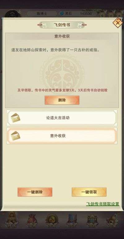 老玩家应该在上线了之后就有看到一封名为意外收获的飞剑传书,说是在地肺山探索时意外获得了一只古朴的戒指。