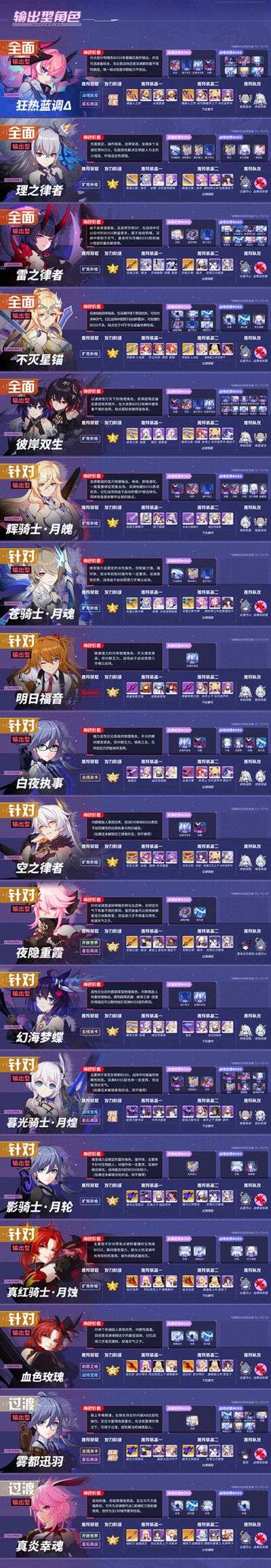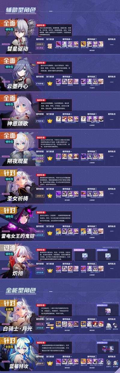 全能型角色则分别推荐一套输出搭配和一套辅助搭配。
