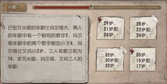 2.已知艾米丽的年龄比玛尔塔大,两人的年龄中有一个相同的数字2,玛尔塔年龄中的两个数字相加小于4,玛尔塔比艾玛小2岁,三人年龄之和为74,求艾米丽、玛尔塔、艾玛三人的年龄: