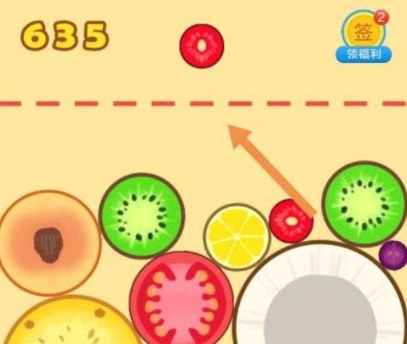 我们可以通过调整水果下落的位置,使得这些水果尽可能的发生合并,如果两个水果不一样,就会一直向上积累,当积累到一定高度时,界面上方会出现一条红色虚线,如果水果超过这条红色虚线,你就失败了(即输了)。