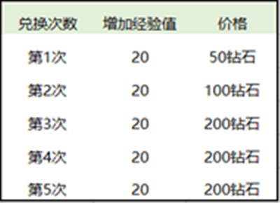 2月10日会开启限时钻石兑换经验值任务,每个英雄第一次兑换50钻石,第二次100钻石,第三到第五次为200钻石。