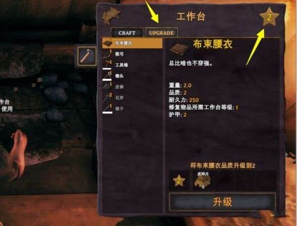 在工作台的upgrade界面可对当前身上的装备进行升级。