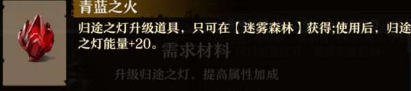 初始的时候,归途之灯的能量为零,可以使用在关卡中获得的“青蓝之火”为【归途之灯】提供能量,一个青蓝之火提升20点能量。