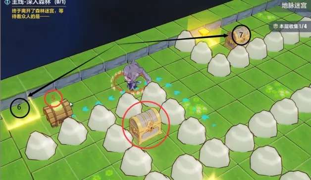 进图先按教学踩几关拿到第一个宝箱,拿完宝箱后再踩2号机关出来,向地图左上角走。