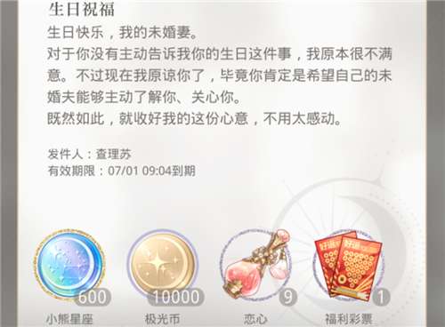 4、查理苏生日祝福:600小熊星座+10000极光币+恋心9个+福利彩票1个