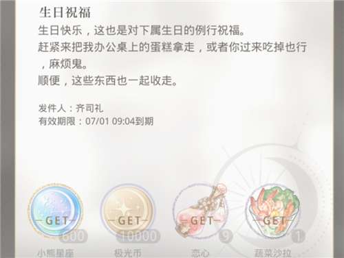 3、齐司礼生日祝福:600小熊星座+10000极光币+恋心9个+蔬菜沙拉1个