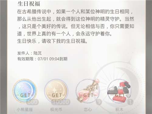 2、陆沉生日祝福:600小熊星座+10000极光币+恋心9个+积木1个