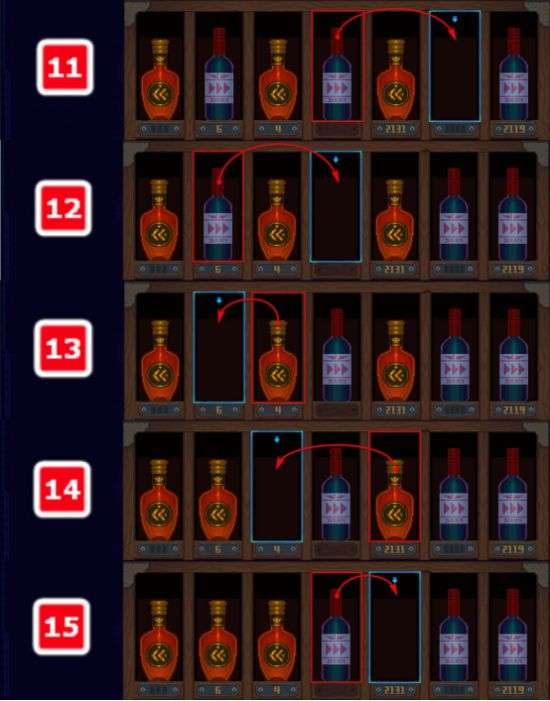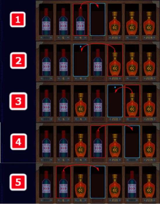 然后就要进行酒瓶换位的小游戏,需要我们把左边的蓝色酒瓶和右边的红色酒瓶的位置掉个个儿。整体是跳棋的玩法,即点击瓶子后,会跳入身边的空格,或者跳入隔一个瓶子的空格。解谜跳法如下图,以标注的数字顺序为步骤,依照箭头的指引移动瓶子。