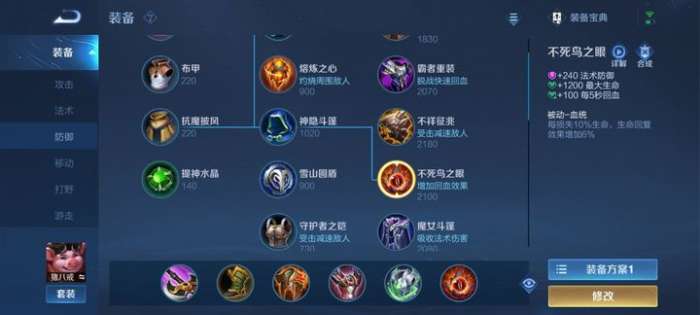 影忍之足增加自身物抗,对方控制多的情况下可以替换成抵抗之靴;巨人之握和红莲斗篷加强双烧流效应,让猪八戒团战中对敌人伤害造成更多;反甲增加物攻和物防,同时对周围敌人造成伤害;不死鸟之眼配合猪八戒技能增加更多回复能力;永夜守护提高猪八戒生存能力。对方法伤高的情况下,可将反伤刺甲换成魔女斗篷,猪八戒六神装时将鞋卖掉换成巨人之握或者复活甲,这样能让猪八戒团战用途更大,生存更久。