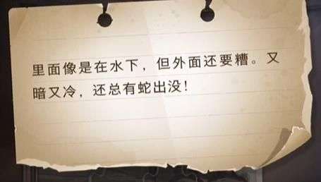 线索一:里面像是在水下,但外面还要糟。又暗又冷,还总有蛇出没!
