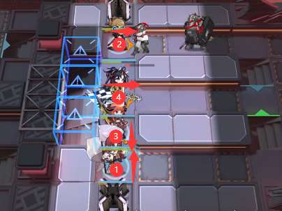 开局如下图所示布置:桃金娘(向上)→ 推进之王(向右)→ 风笛(向下)→ 煌(向右)