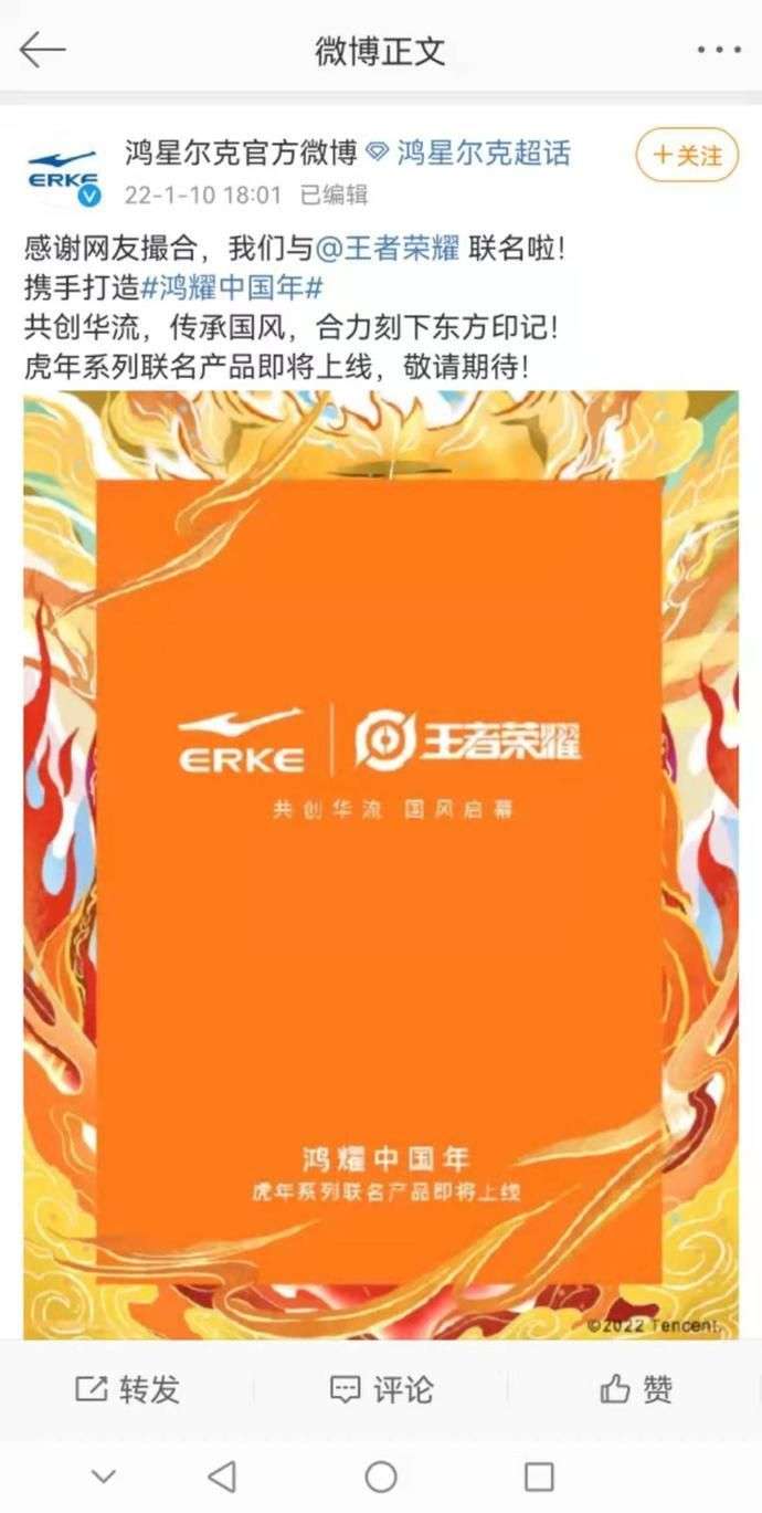 1月11日,鸿星尔克正式官宣联名《王者荣耀》,2022虎年限定系列产品今日预售,价格499元。