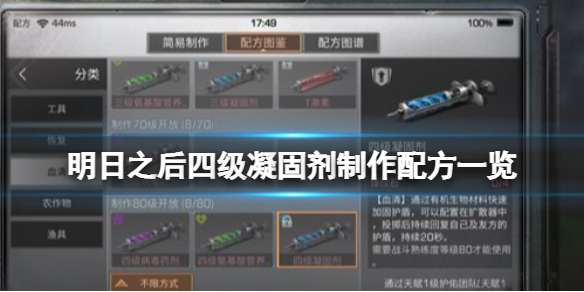 以上就是明日之后四级凝固剂制作配方一览的全部内容了,希望能够帮助到各位玩家。更多游戏相关的内容各位玩家们可以关注,会一直给各位玩家们带来手游攻略。