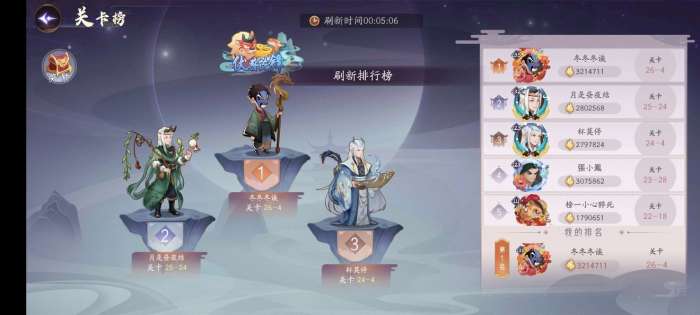 排行榜的话分为六大阵营的积分榜(拥有的阵营灵妖品质),以及我们最关心的关卡榜和爬塔榜,点击左上角的宝箱可以看到别人的某个节点的通关时间。榜1大哥的最爱地之一!
