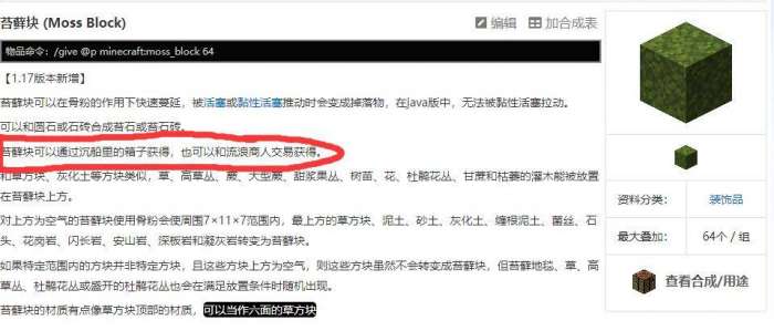 首先我们搜索并进入我的世界苔藓块的相关说明,然后就可以在界面中间发现苔藓块可以在沉船里的箱子获得,也可以和流浪商人交易获得。