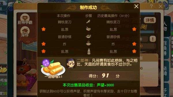 当菜谱分达到80时,使用“快速研制”,做20道“一品春卷”即可解锁到5级食肆