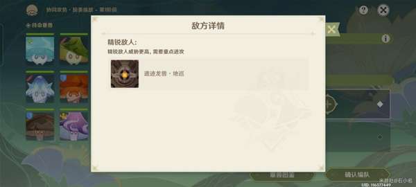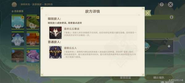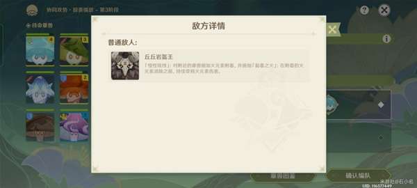 通关条件:进行三轮挑战,并打败三轮中的所有魔物,就算通过挑战。进入秘境后,第一轮挑战:遗迹龙兽·地巡。第二轮挑战:雷斧丘丘暴徒+雷箭丘丘人。第三轮挑战:丘丘岩盔王。