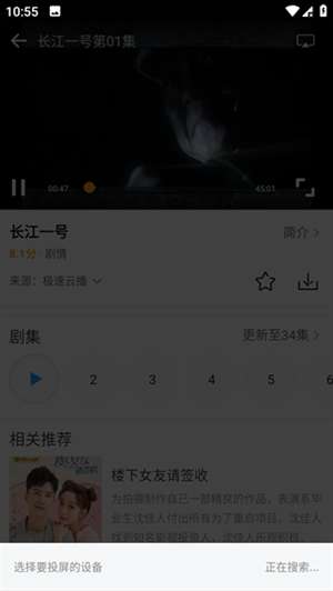 爱电影视app怎么投屏,在本站下载安装软件,打开进入主页,选择一部自己需要观看的影视,比如我们打开长江一号,然后点击一下播放出,弹出窗格,我们就会发现右上角有个图标,点击它,然后软件就会自动搜寻投屏设备,选择您需要投屏的设备即可!