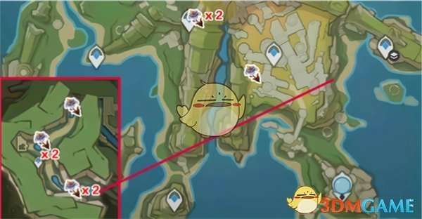 奥齐卡纳塔【遗迹左下、右上角小岛】:可通过滑翔或水路到达小岛,采集零散分布的材料。
