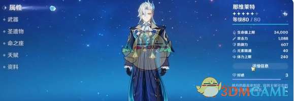 3、元素充能效率:那维莱特的大招比较重要,适当堆叠充能效率可确保大招及时释放,提升技能循环流畅度。