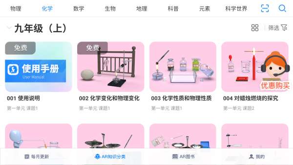 3、点击AR知识分类,这里拥有丰富的学科内容,里面包含数学、物理、化学、地理、生物和科普等初中阶段数百个知识点。