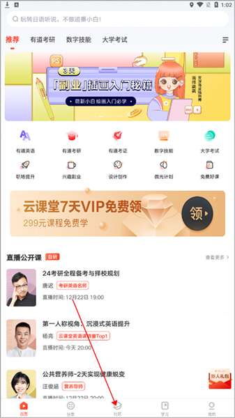 1、打开网易云课堂App,点击中间的社区,如图所示。