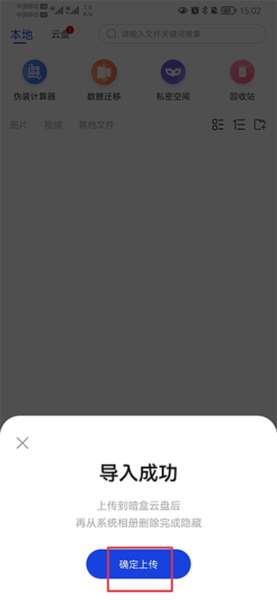 想要在暗盒内导入图片,我们可以先打开暗盒app,在“文件”页面点击右下角蓝色加号,选择要导入的照片,确认选择后点击“确定”上传,上传成功后在云盘页面下拉刷新,即可看到刚上传的照片。操作起来十分的方便。