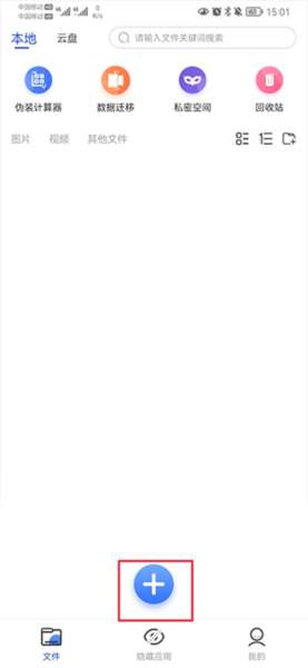 1、打开暗盒app,在文件页面中点击蓝色加号